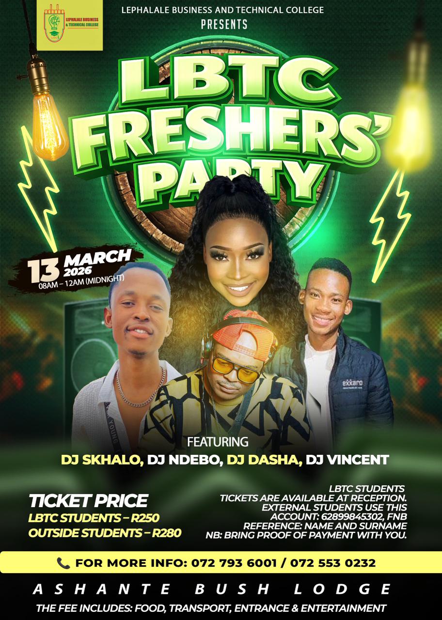 FEATURING DJ SKHALO, DJ NDEBO, DJ DASHA, DJ VINCENT TIME: 08H00-00:00 MIDNIGHT TICKET PRICE LBTC STUDENT-R250 OUTSIDE STUDENTS-R280 FOR LBTC STUDENTS, TICKETS AVAILABLE AT RECEPTION. EXTERNAL STUDENTS USE: 62899845302 FNB, REF: NAME AND SURNAME. NB: BRING PROOF OF PAYMENT WITH YOU. MORE INFO: 072 793 6001/072 553 0253